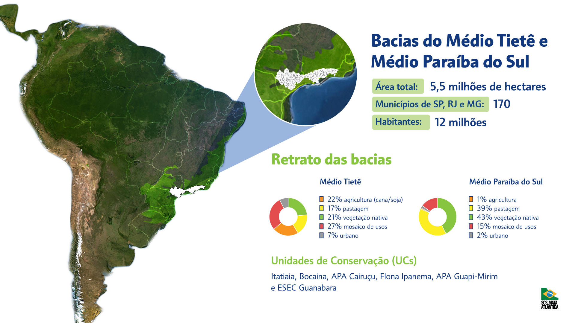 As bacias do Médio Tietê e do Médio Paraíba do Sul, que se estendem por 5,5 milhões de hectares e abrangem 170 municípios dos estados de São Paulo, Rio de Janeiro e Minas Gerais, são um retrato do país: regiões de alta densidade populacional e econômica, mas também com grandes pressões ambientais.